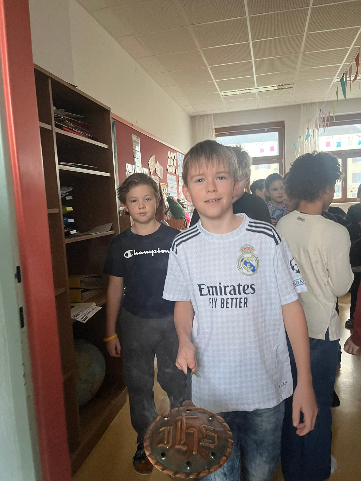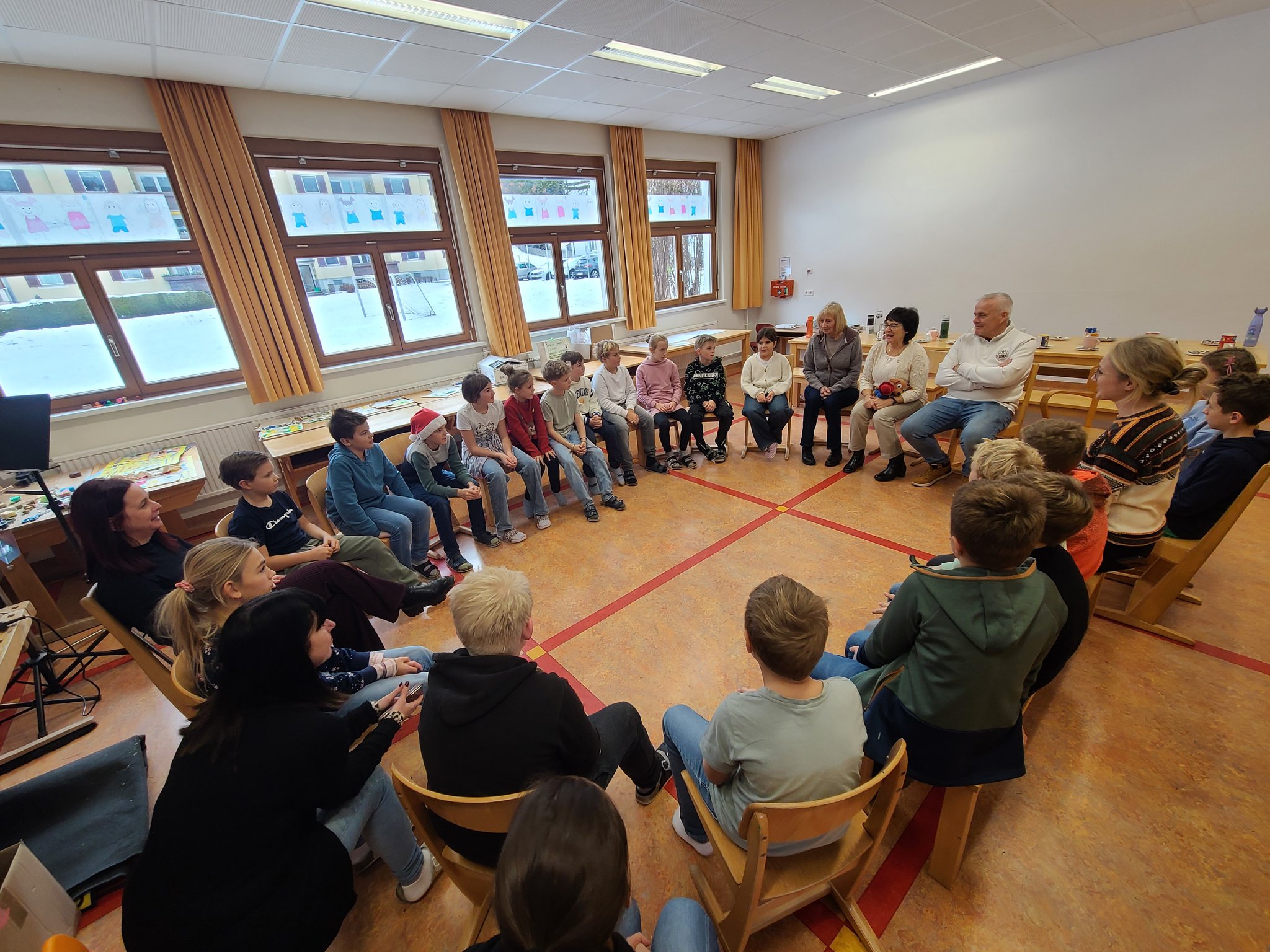 Im Anschluss durften wir unseren Bürgermeister Franz Zach bei uns begrüßen, der extra zu uns in die Schule gekommen war, um den Kindern den Brauch des „Rachn gehens“ anschaulich zu erklären.