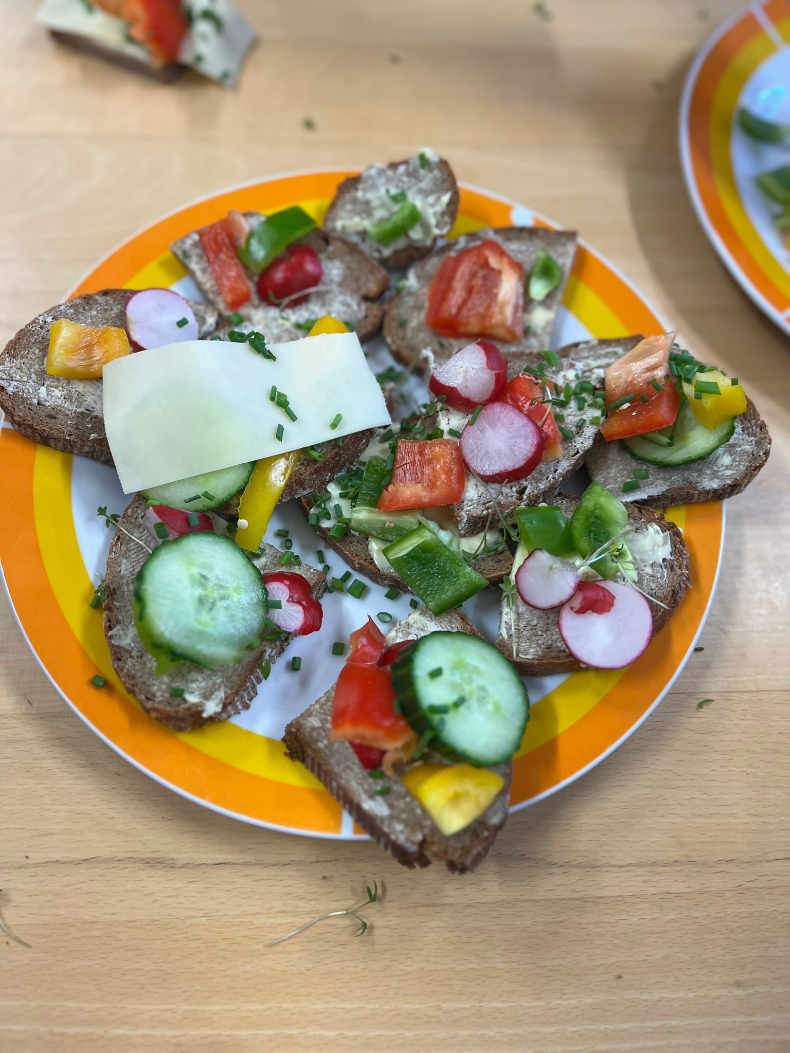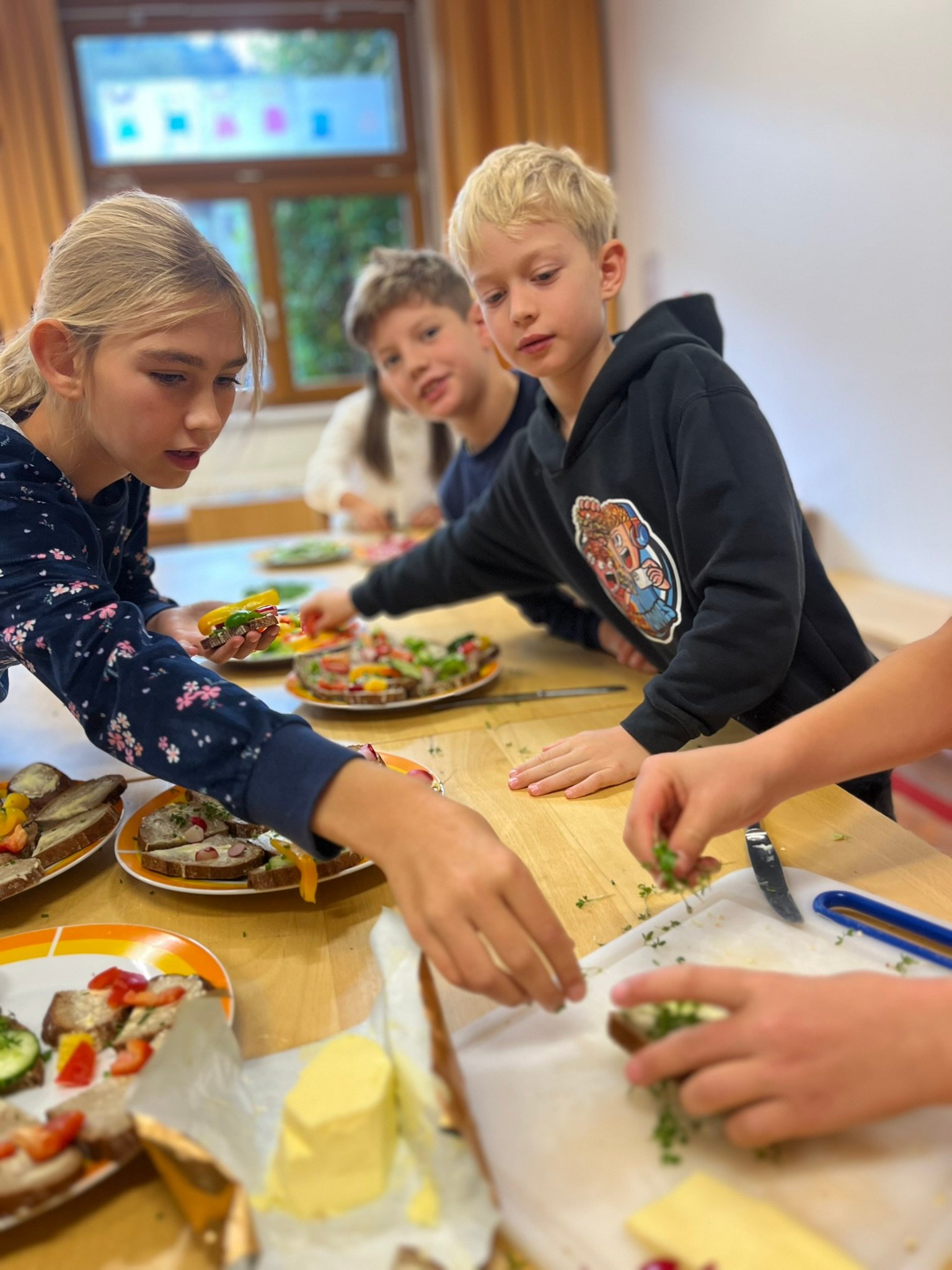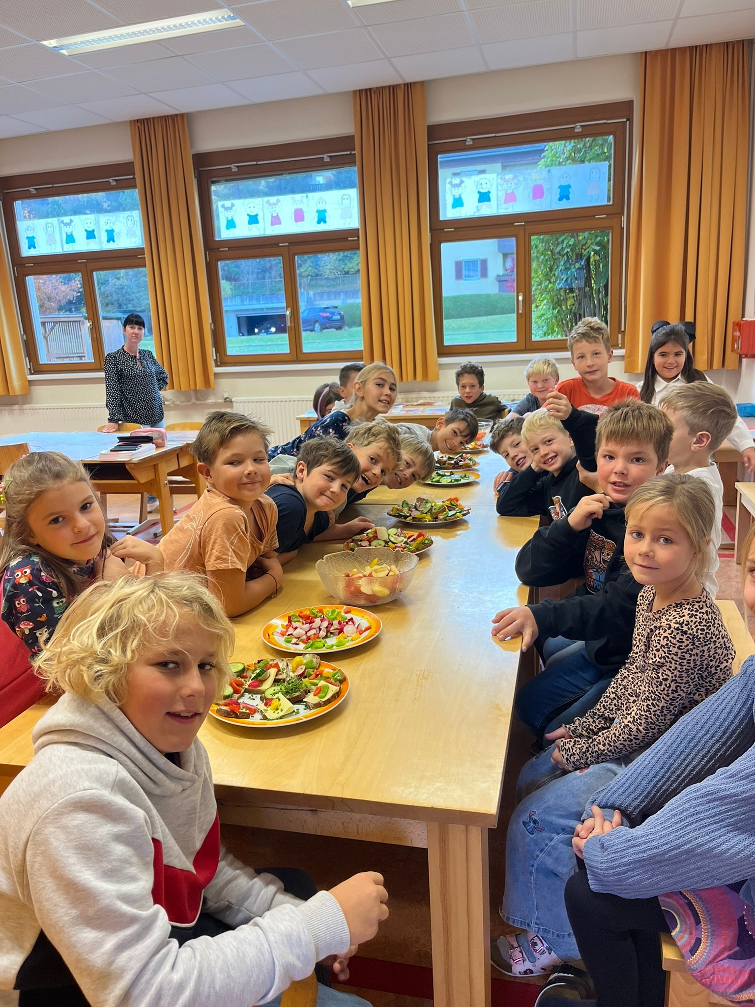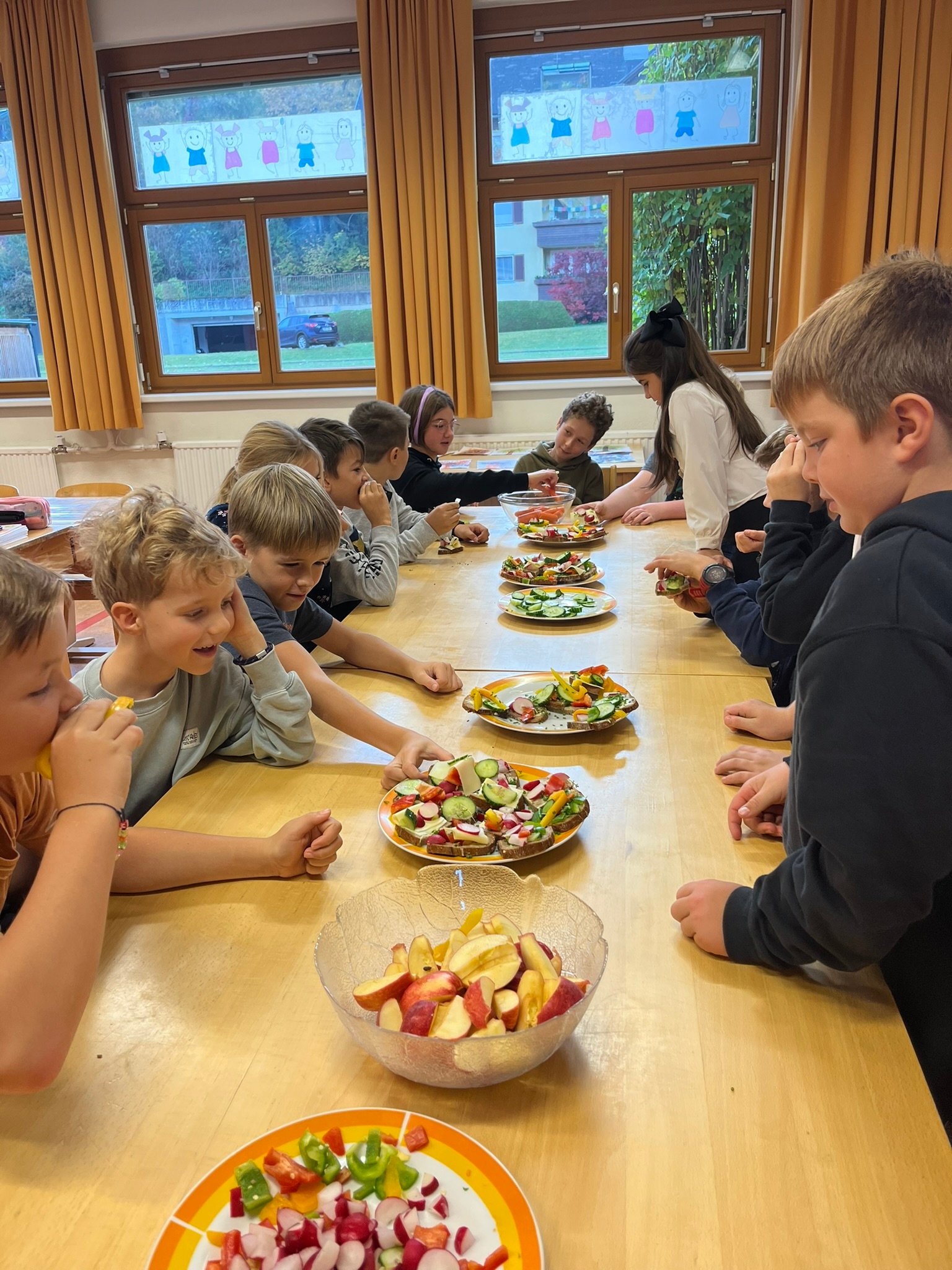Am Dienstag, dem 21. Oktober, bereitete die 3. Stufe gemeinsam für die gesamte Klasse eine gute und gesunde Jause zu: belegte Brote mit viel frischem Gemüse und Obst. Dabei erarbeiteten die