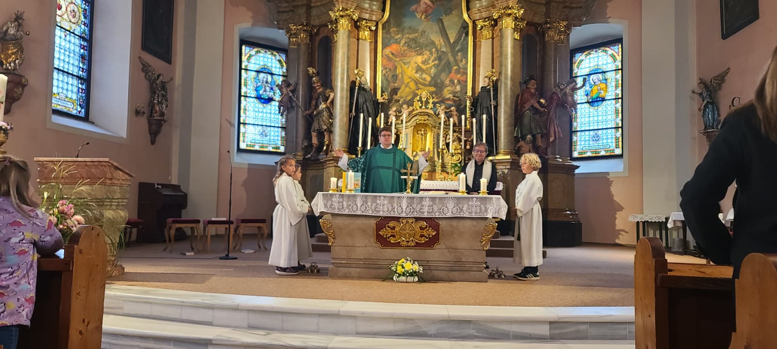 Zum Start ins neue Schuljahr feierten wir einen fröhlichen und lebendigen Gottesdienst mit unserem neuen Religionslehrer Walter Greimeister, dem neuen Pfarrer P. Vinzenz und dem evangelischen