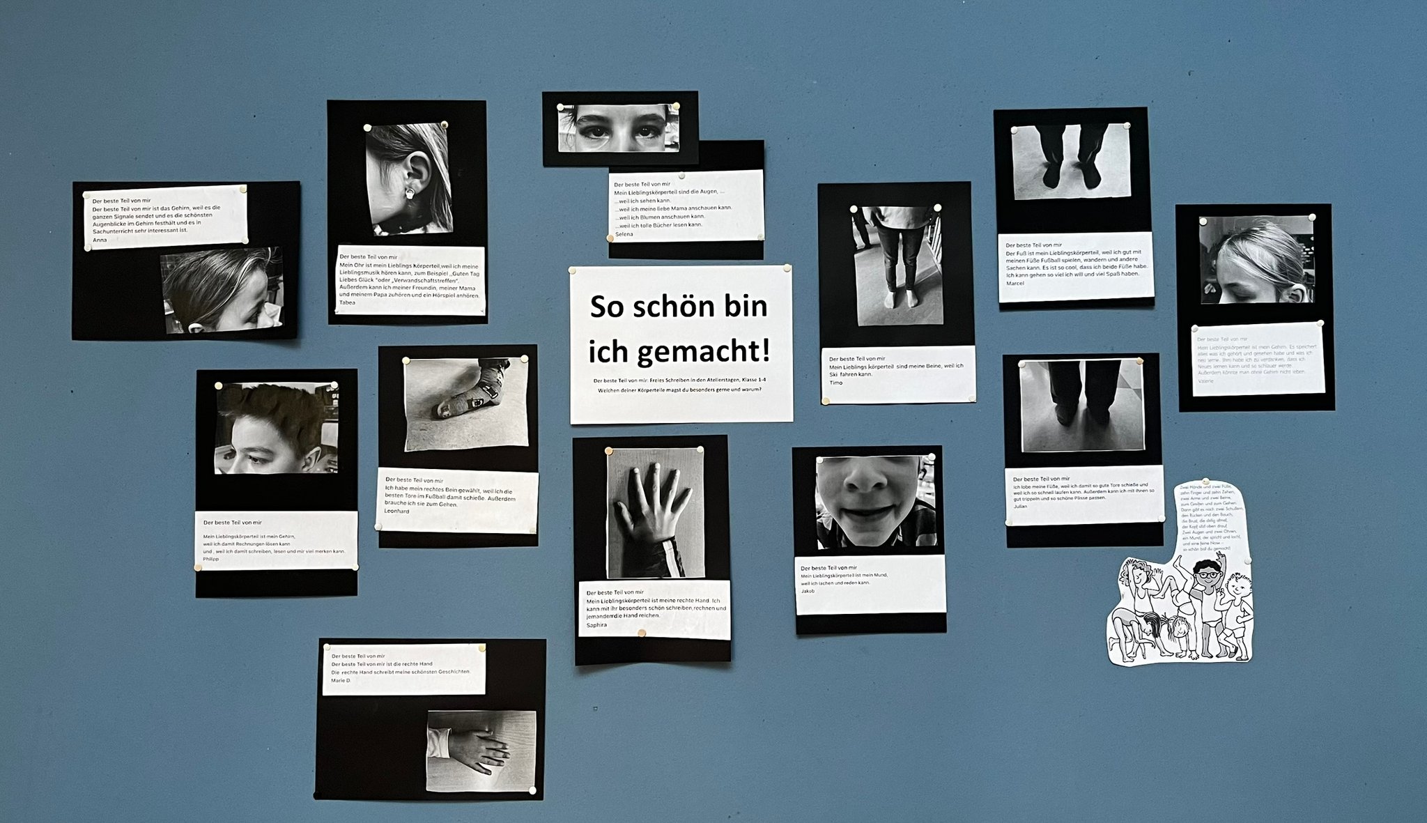 Im Deutsch-Atelier „So schön bin ich gemacht“ steht das Staunen über uns selbst im Mittelpunkt. Mit einem Bilderbuch, einem Gedicht und eigenen Texten beschäftigen sich die Kinder kreativ mit
