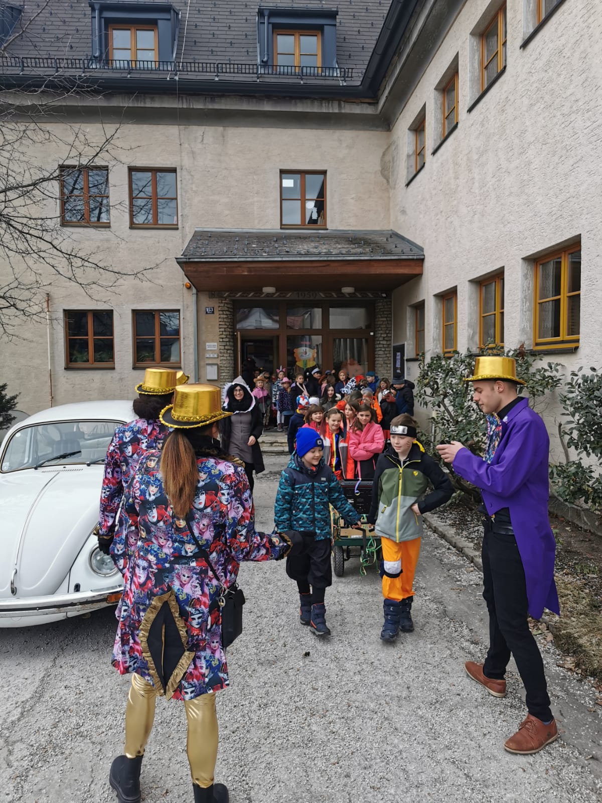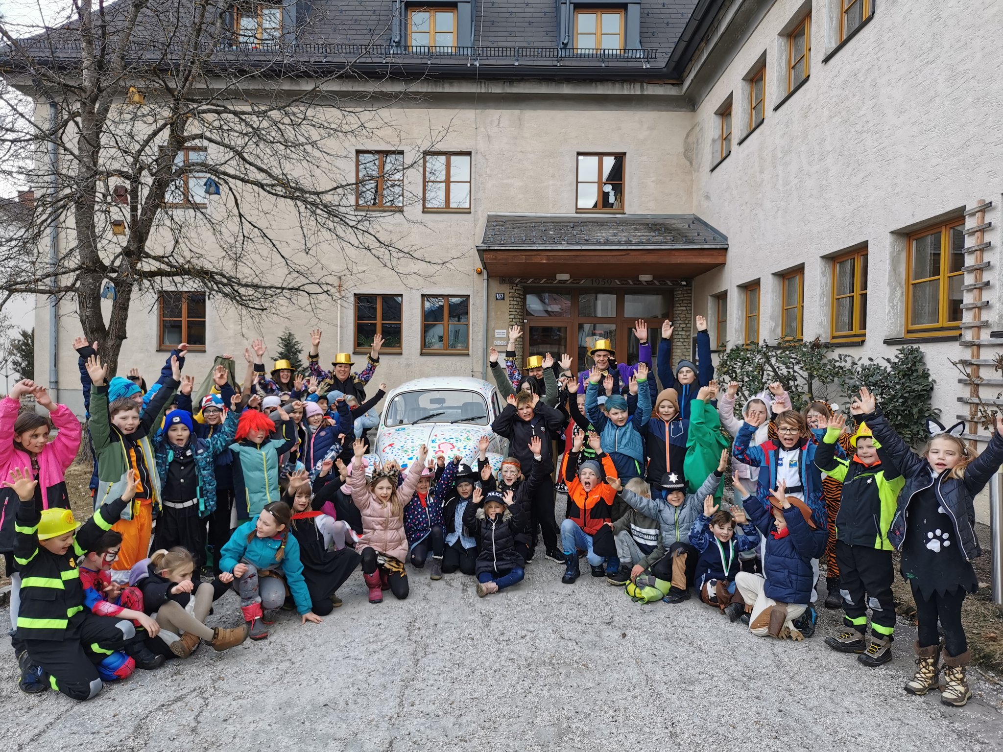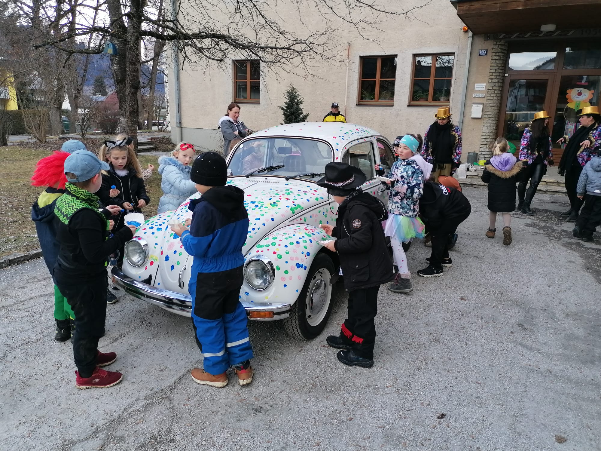 Gemeinsam mit dem Faschingsverein Öblarn- Niederöblarn gab es am Freitag einen kleinen Umzug durch Öblarn zum Hauptplatz und wieder zurück. Die Kinder hatten eine Menge Spaß bei den Liedern und Tänzen. Außerdem durften sie vor der Schule einen VW Käfer bunt gestalten. Anschließend bekam jedes Kind einen Faschingkrapfen.