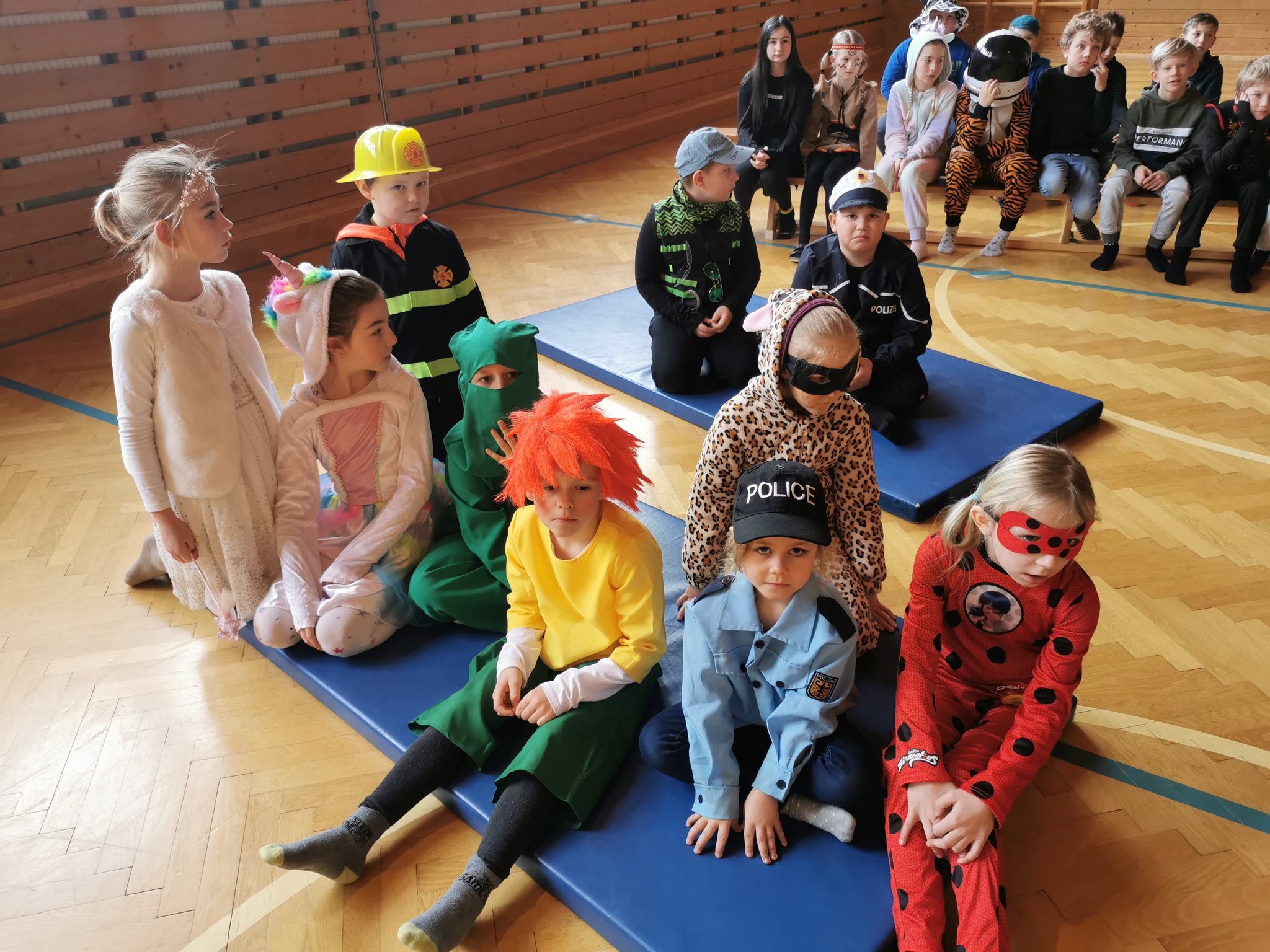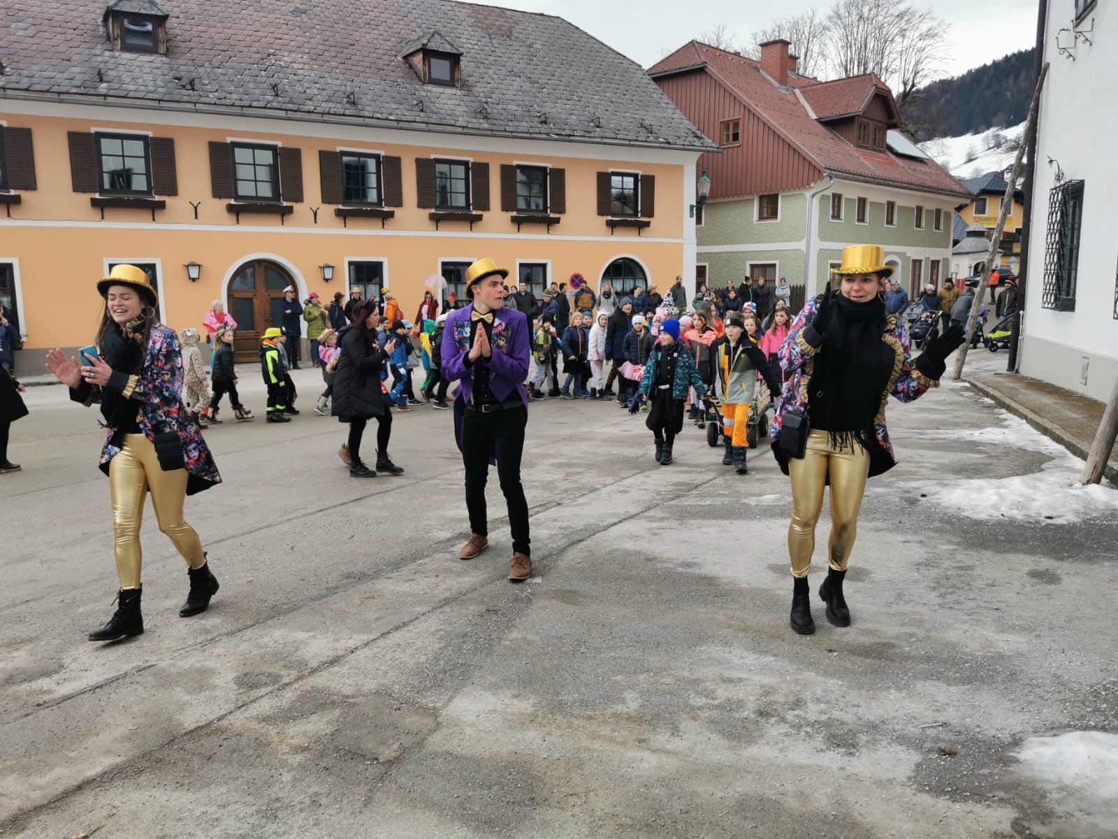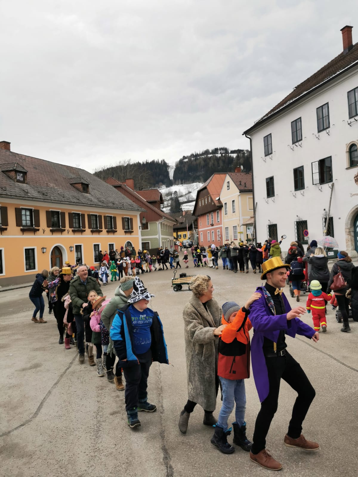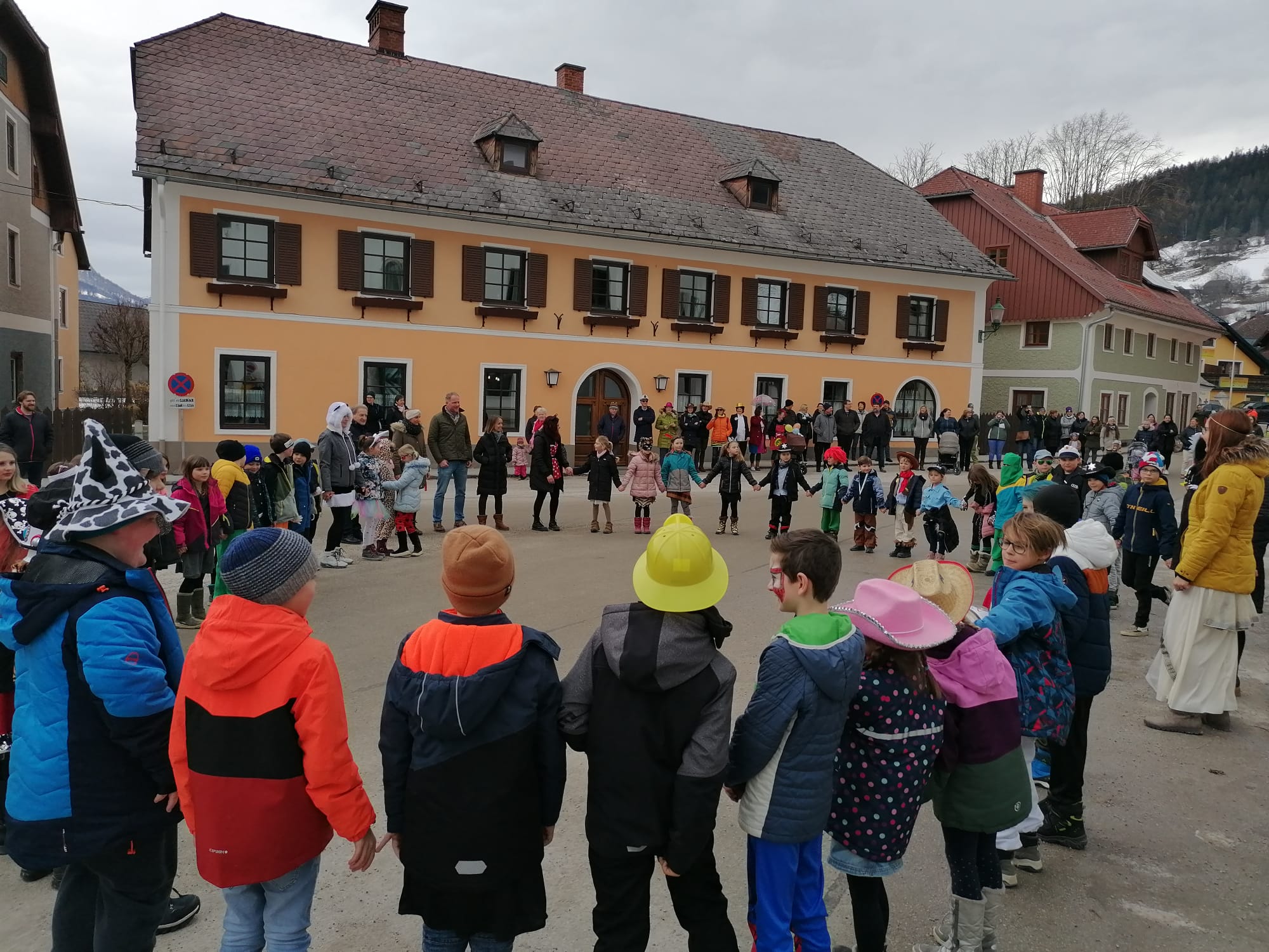 Gemeinsam mit dem Faschingsverein Öblarn- Niederöblarn gab es am Freitag einen kleinen Umzug durch Öblarn zum Hauptplatz und wieder zurück. Die Kinder hatten eine Menge Spaß bei den Liedern und Tänzen. Außerdem durften sie vor der Schule einen VW Käfer bunt gestalten. Anschließend bekam jedes Kind einen Faschingkrapfen.