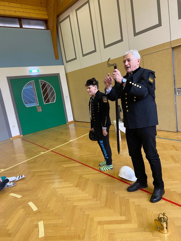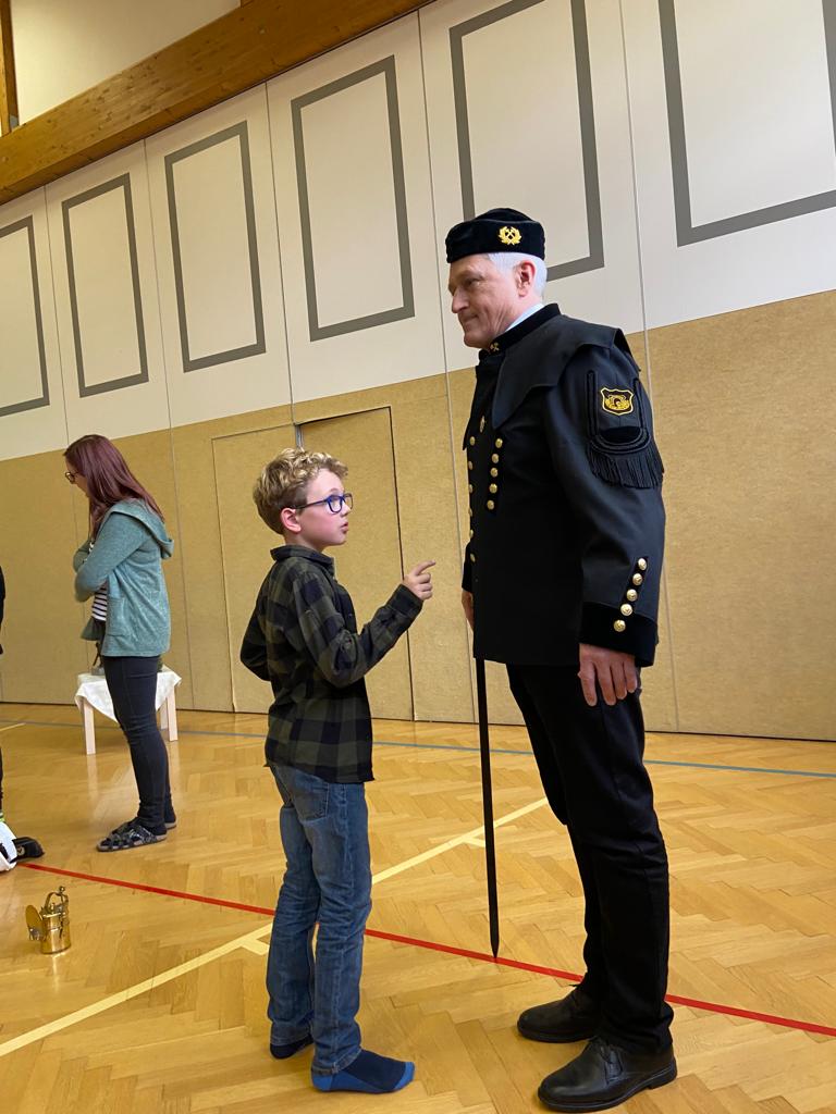 Gemeinsam machten wir uns auf die Suche nach Besonderheiten an dieser Kleidung in Bezug auf die Legende der Hl. Barbara. Dafür erzählte uns der Bergbauvereinsobmann die Legende der Hl. Barbara und zeigte uns an verschiedenen Stationen Barbarastatuen, Bergbauwerkzeuge und vieles mehr. Die Kinder erfuhren beispielsweise, warum die schwarze Jacke 29 goldene Knöpfe hat und drei davon immer offen getragen werden. Bei den spannenden Erzählungen und Informationen waren sie sehr interessiert bei der Sache.