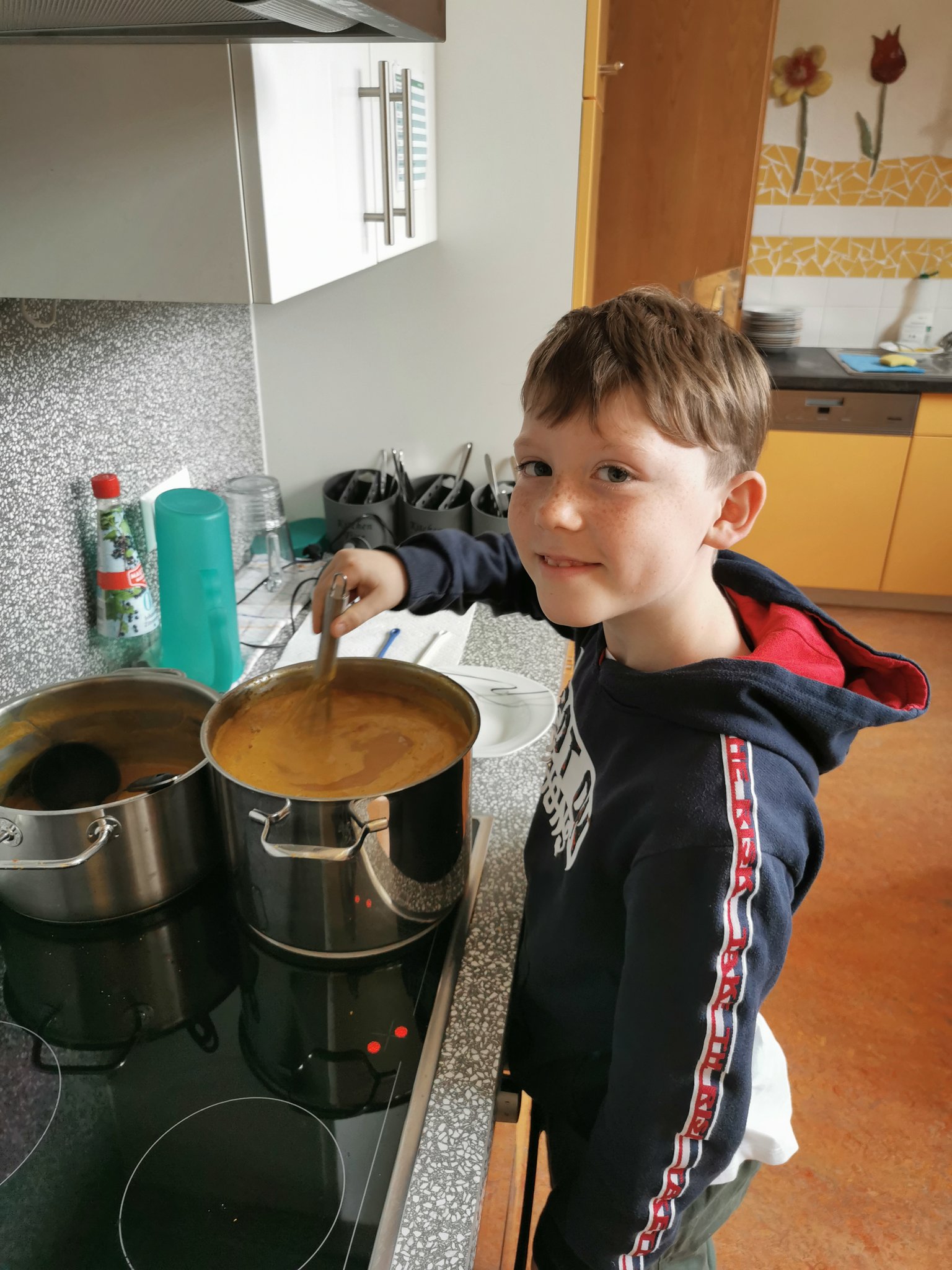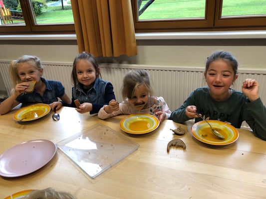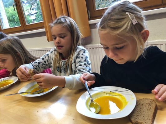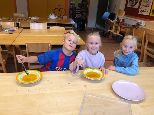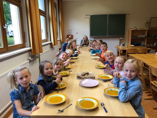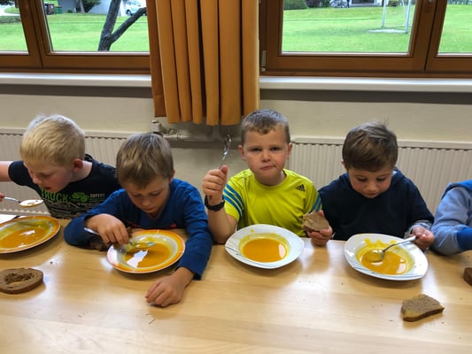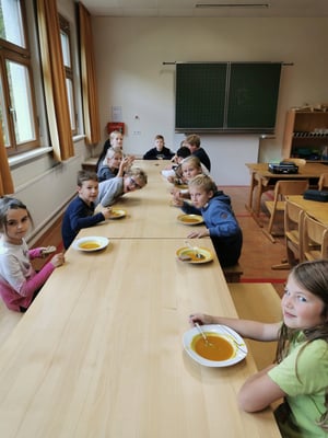 Die Kinder der Nachmittagsbetreuung verarbeiteten die Kürbisse unseres Erntewagens zu einer leckeren Kürbiscremesuppe. Diese durften dann am nächsten Tag alle Schülerinnen und Schüler mit Genuss verspeisen.