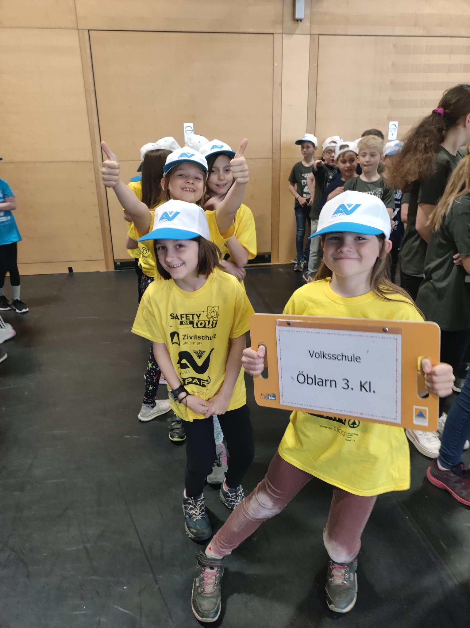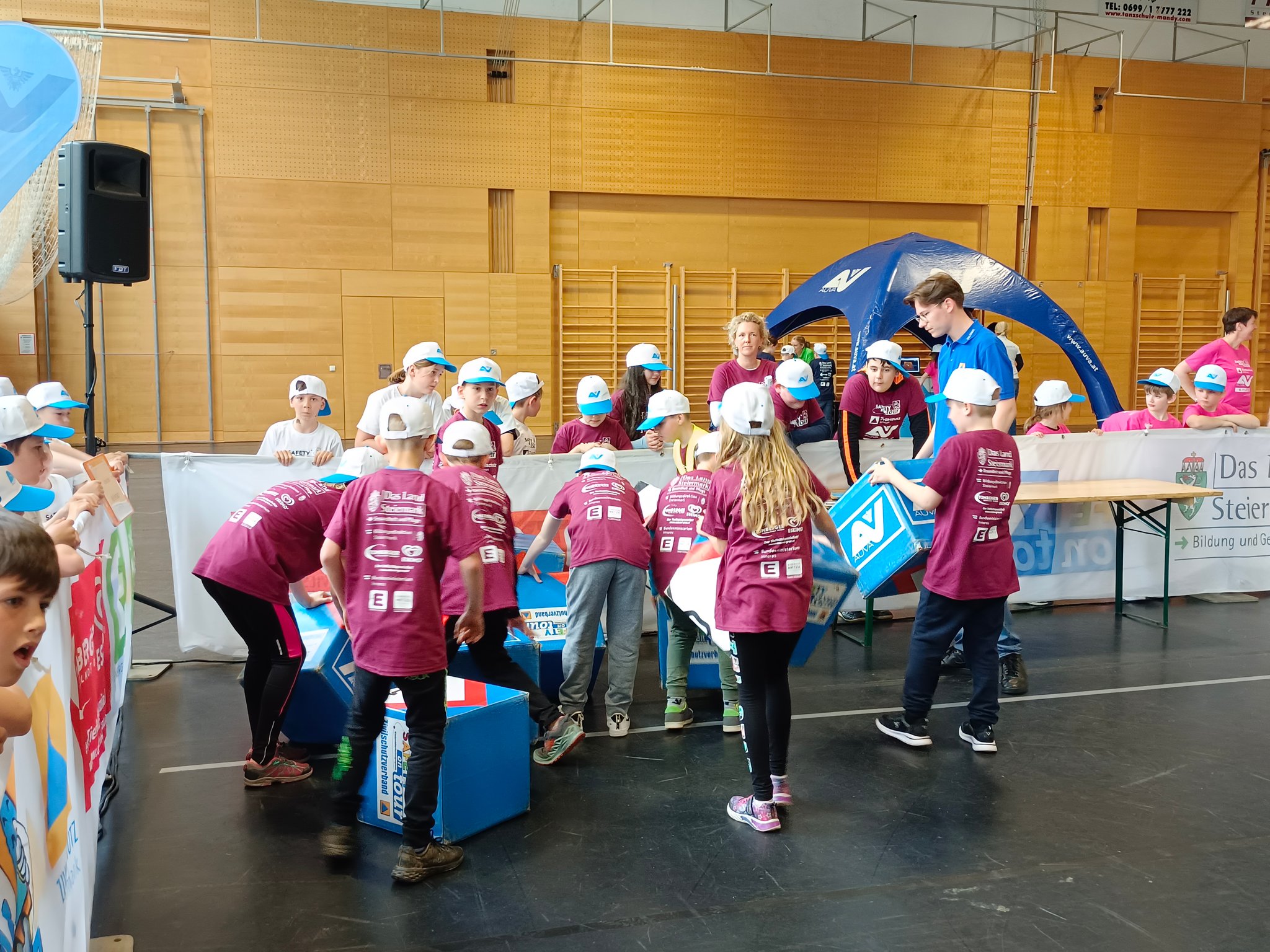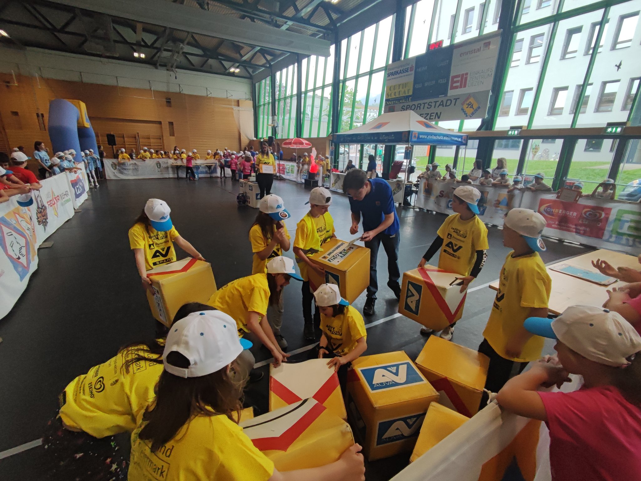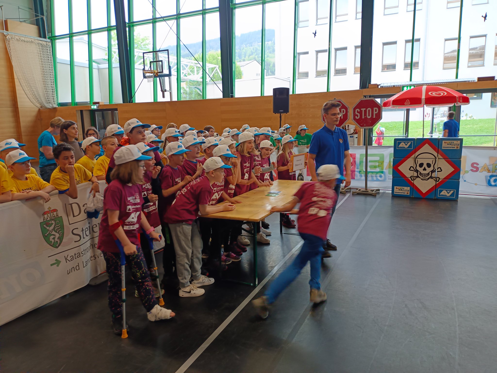 Am Donnerstag, dem 11.05. waren die 3. und 4. Klasse bei der Safety Tour in Liezen. Bei dieser Kindersicherheitsolympiade durften die Kinder bei vier Bewerben ihr Wissen und Talent unter Beweis stellen. Es gab ein Wissensquiz, ein Gefahrenstoff-Würfelpuzzle, einen Erste-Hilfe-Parcours und einen Löschbewerb. Insgesamt nahmen 17 Schulklassen aus diesem Bezirk daran teil. Alle Schülerinnen und Schüler waren mit viel Begeisterung dabei und engagierten sich für ihr Team. Zwischendurch gab es die Möglichkeit an einem Gewinnspiel der AUVA teilzunehmen und einen Blick in die Einsatzfahrzeuge der Rettung und der Polizei zu werfen. So verging dieser aufregende Vormittag wie im Flug.
