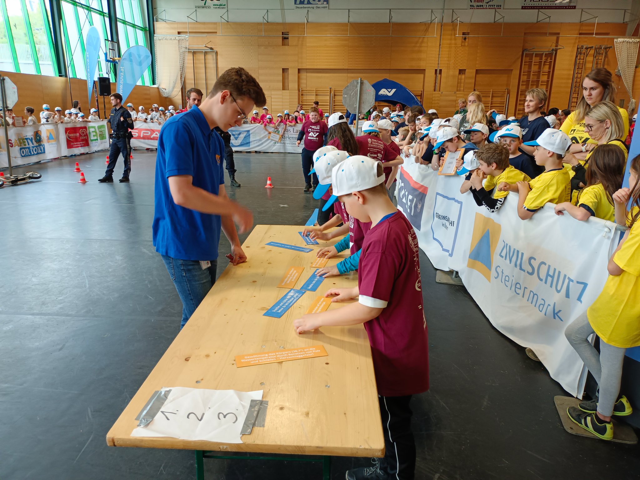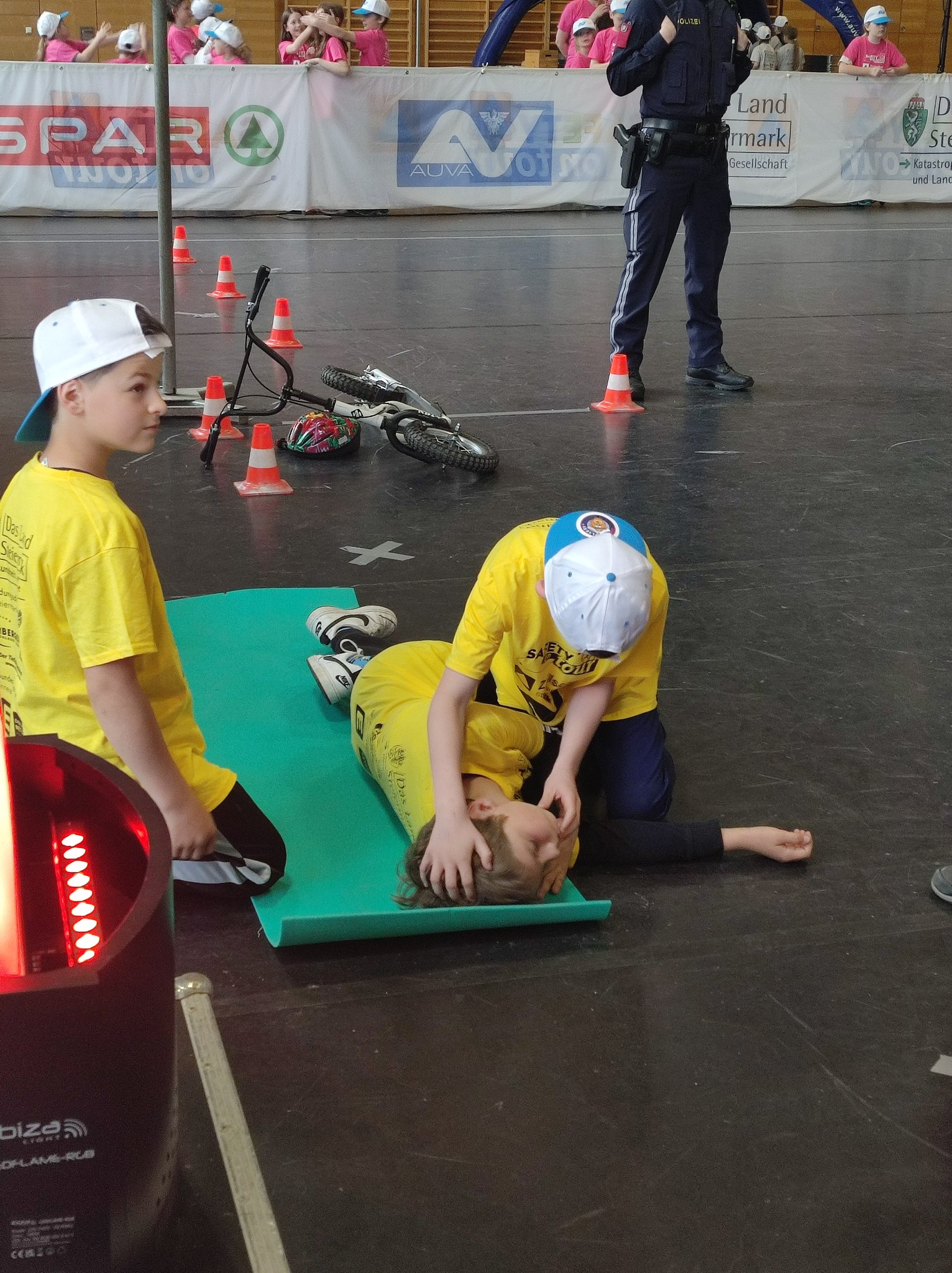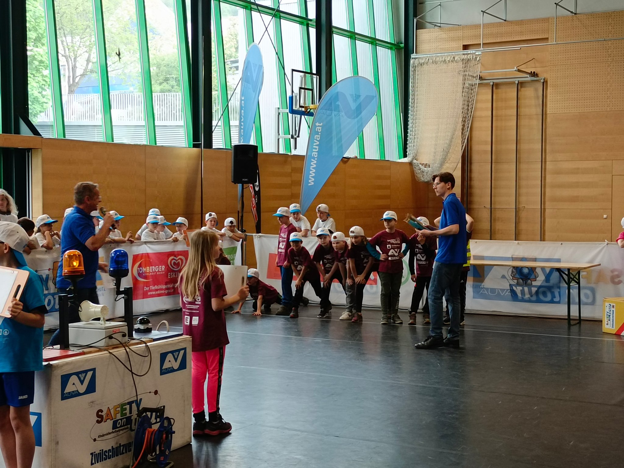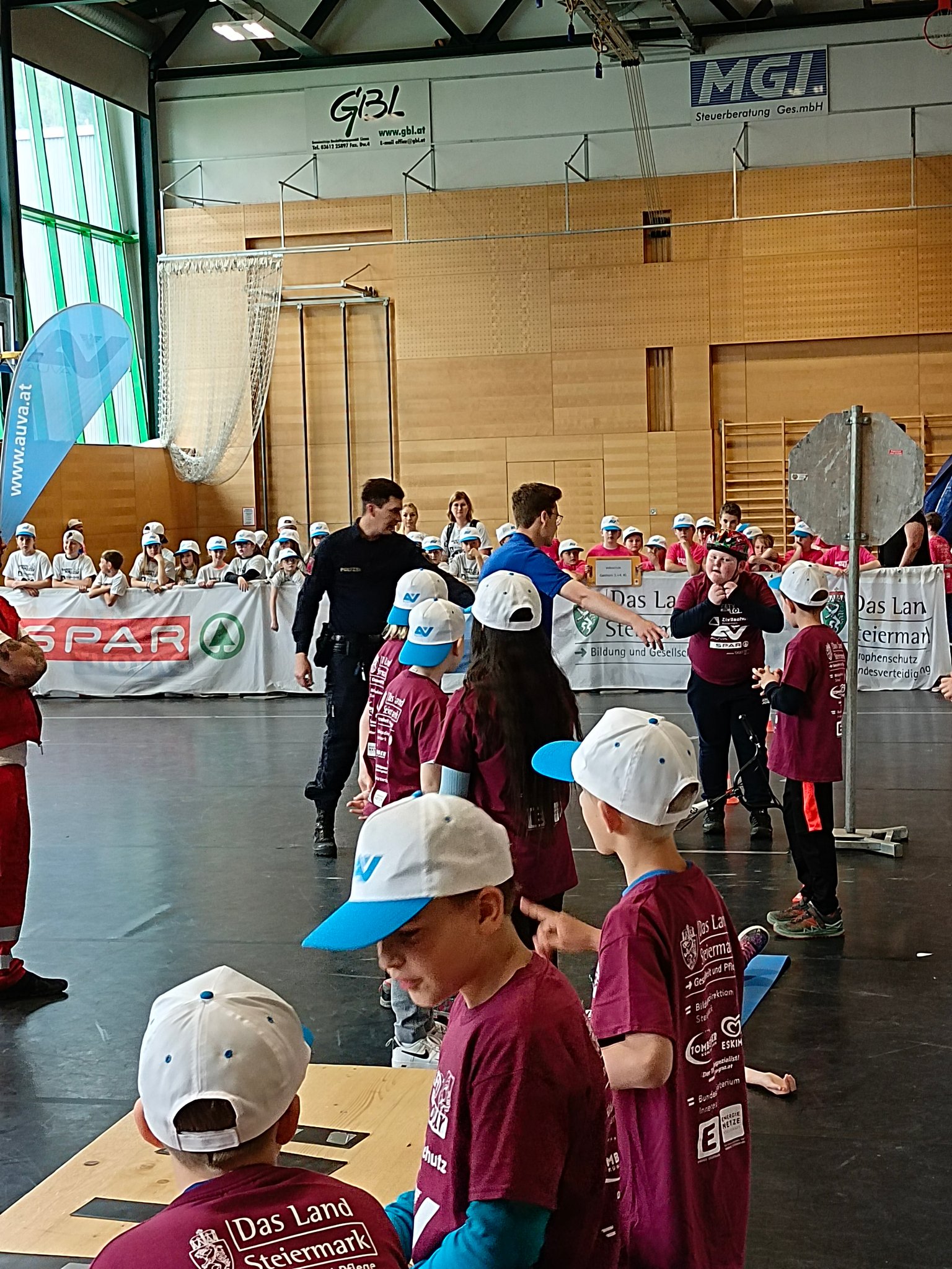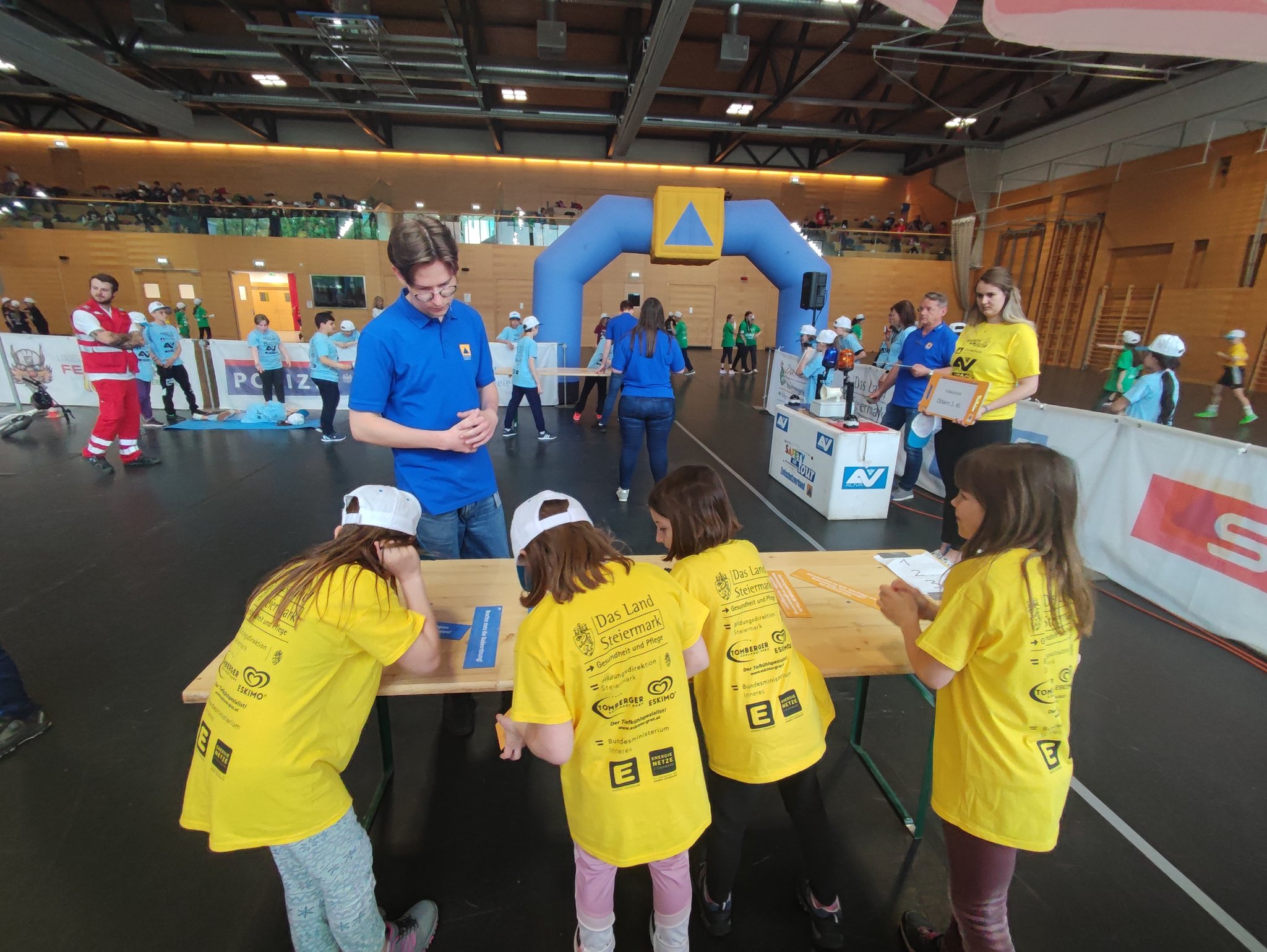 Am Donnerstag, dem 11.05. waren die 3. und 4. Klasse bei der Safety Tour in Liezen. Bei dieser Kindersicherheitsolympiade durften die Kinder bei vier Bewerben ihr Wissen und Talent unter Beweis stellen. Es gab ein Wissensquiz, ein Gefahrenstoff-Würfelpuzzle, einen Erste-Hilfe-Parcours und einen Löschbewerb. Insgesamt nahmen 17 Schulklassen aus diesem Bezirk daran teil. Alle Schülerinnen und Schüler waren mit viel Begeisterung dabei und engagierten sich für ihr Team. Zwischendurch gab es die Möglichkeit an einem Gewinnspiel der AUVA teilzunehmen und einen Blick in die Einsatzfahrzeuge der Rettung und der Polizei zu werfen. So verging dieser aufregende Vormittag wie im Flug.