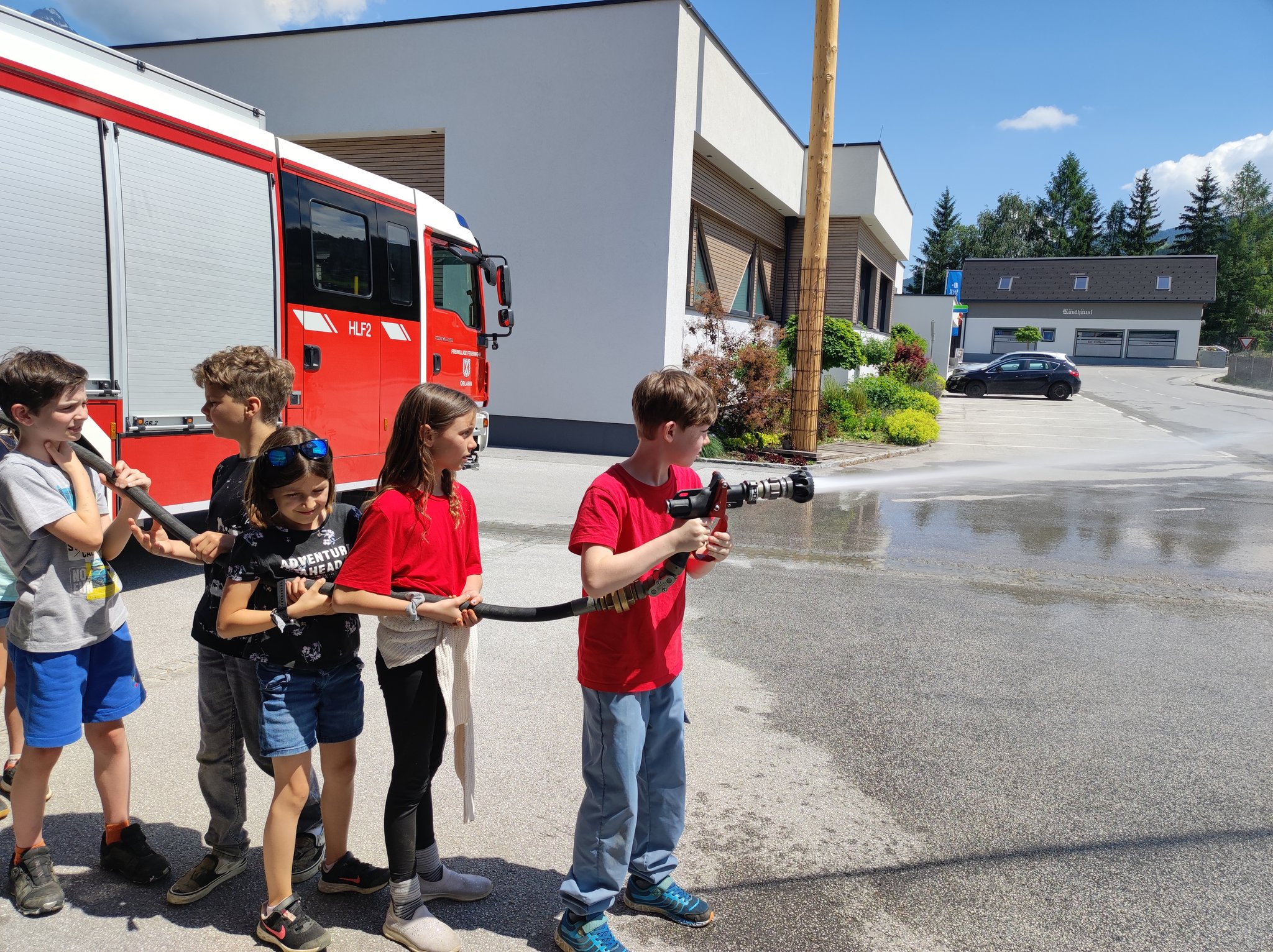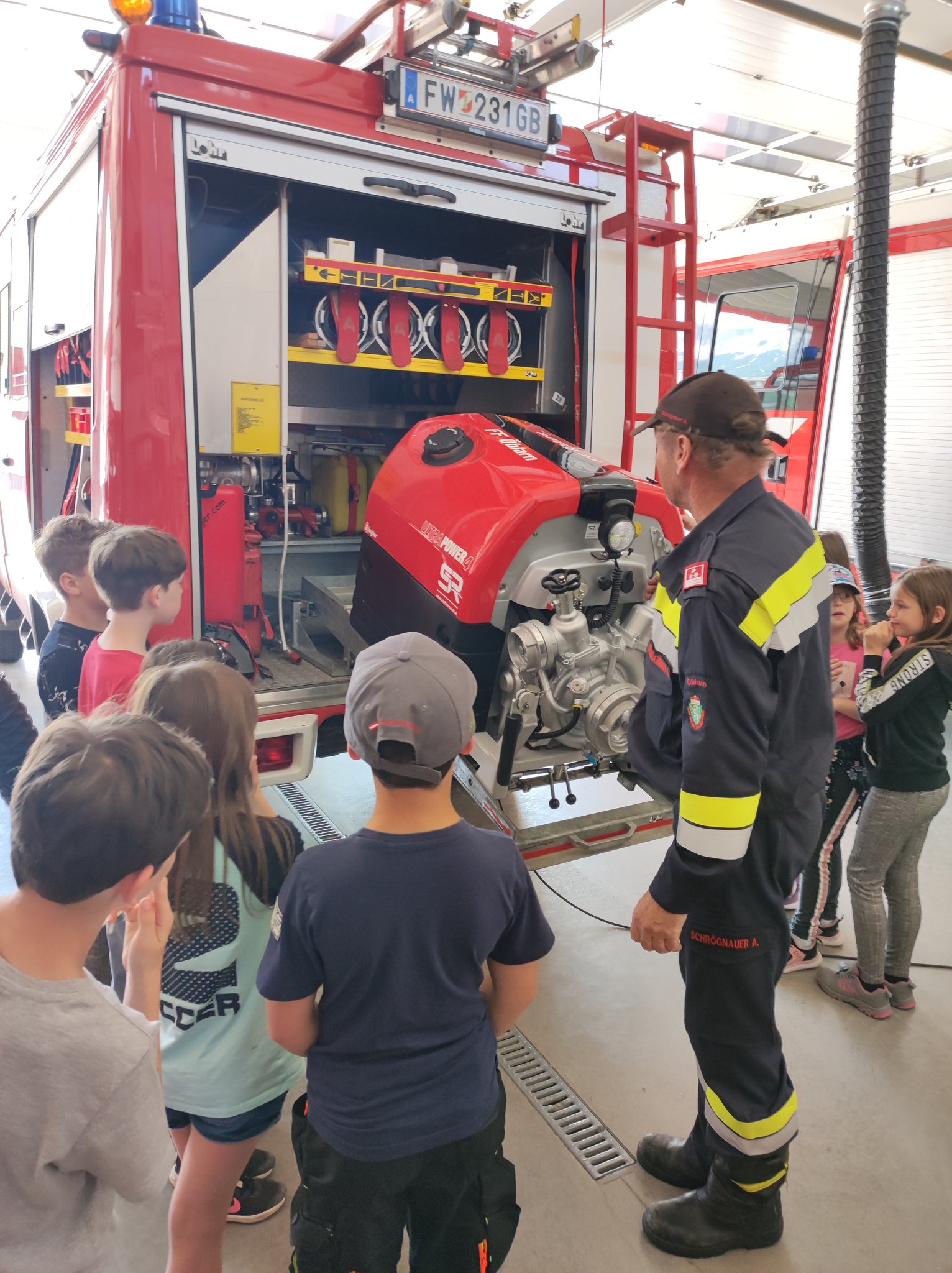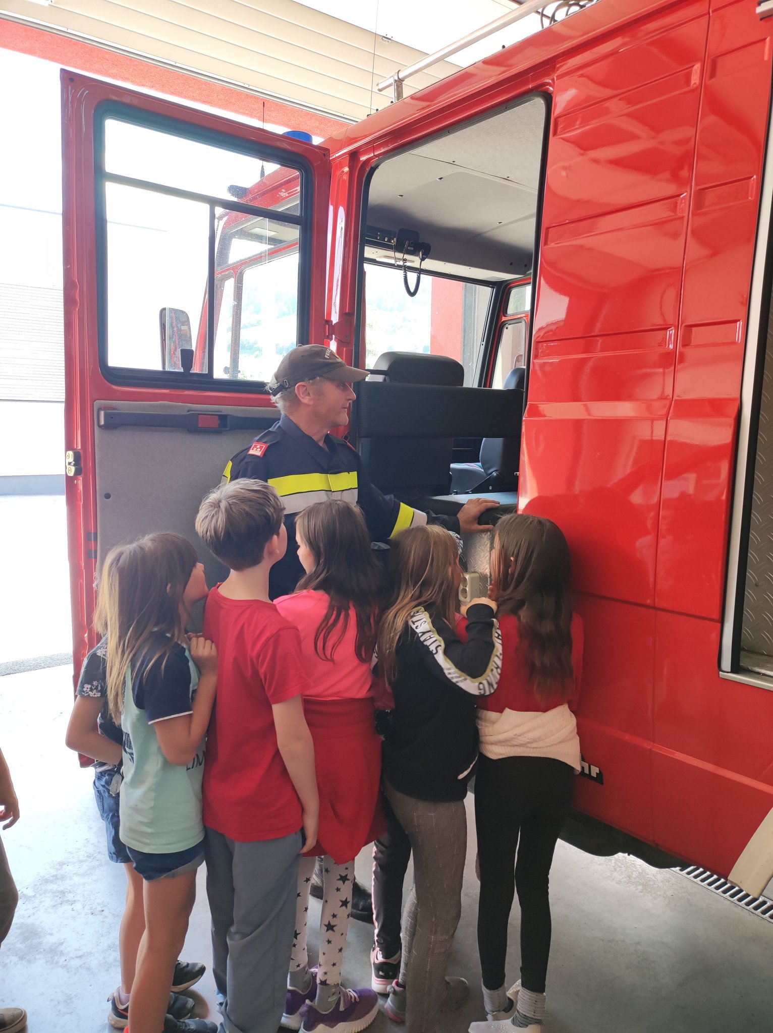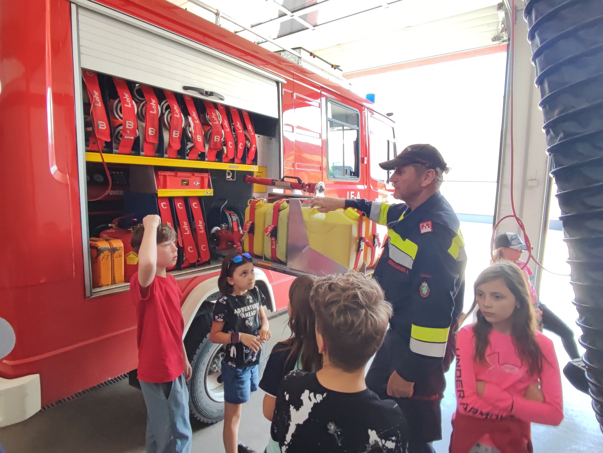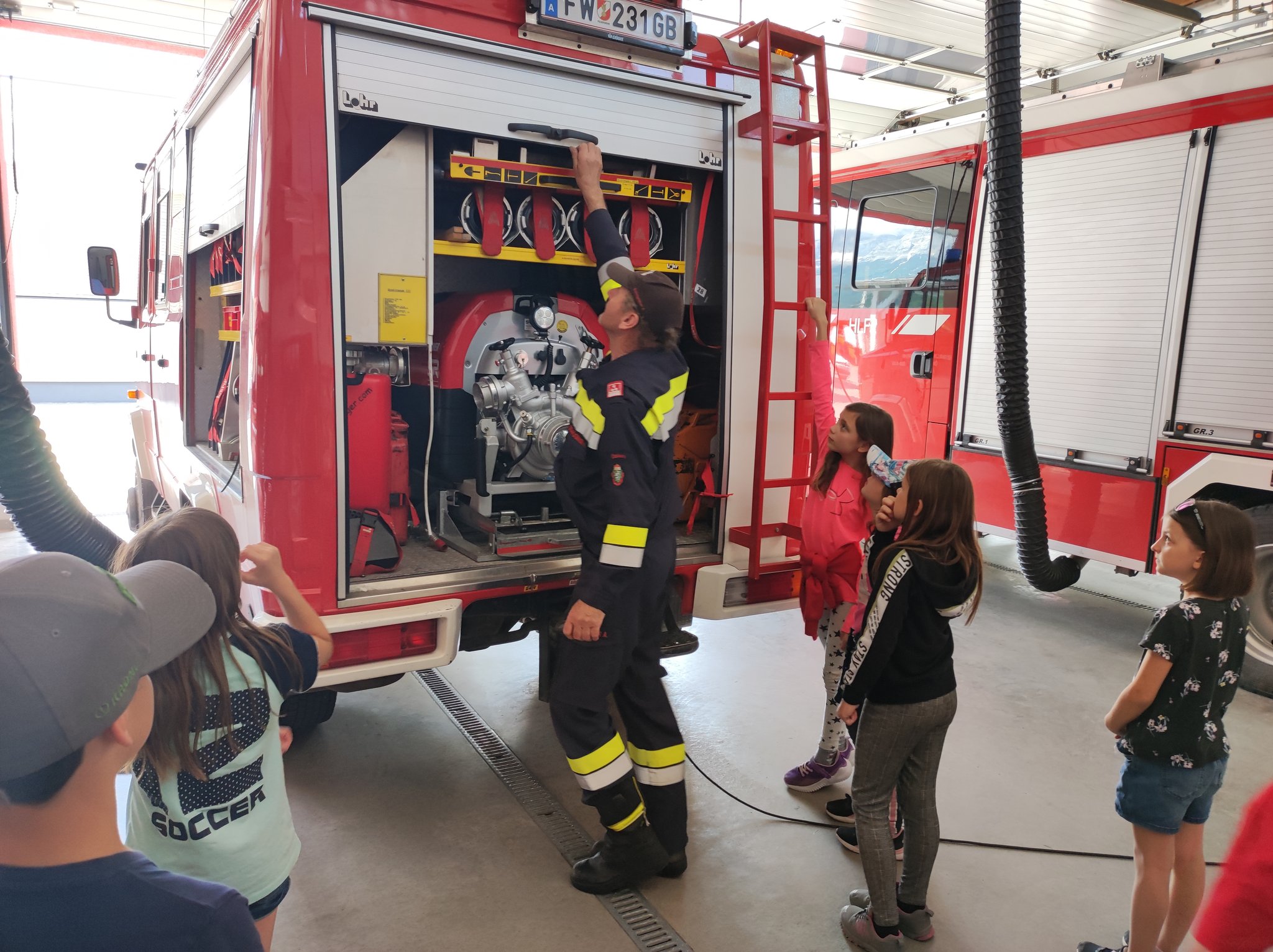 Am Montag, den 12.6., durften die SchülerInnen der 3. Klasse einen Blick in das Rüsthaus der Freiwilligen Feuerwehr Öblarn werfen. Herr Schrögnauer führte die Kinder gekonnt durch das Gebäude und erzählte viel Wissenswertes über die Aufgaben der Feuerwehr. Während die SchülerInnen einen genauen Einblick in das Innere der Einsatzfahrzeuge bekamen, konnten auch Atemschutzmasken, Gurte und das Tragen der Sauerstoffflaschen ausprobiert werden. Zum Schluss des interessanten Lehrausganges durften die Kinder auch noch mit dem Schlauch hantieren. Das machte natürlich sehr viel Spaß! Zu guter Letzt wurden die SchülerInnen auch noch mit dem Einsatzfahrzeug zur Schule gebracht. Herzlichen Dank dafür!