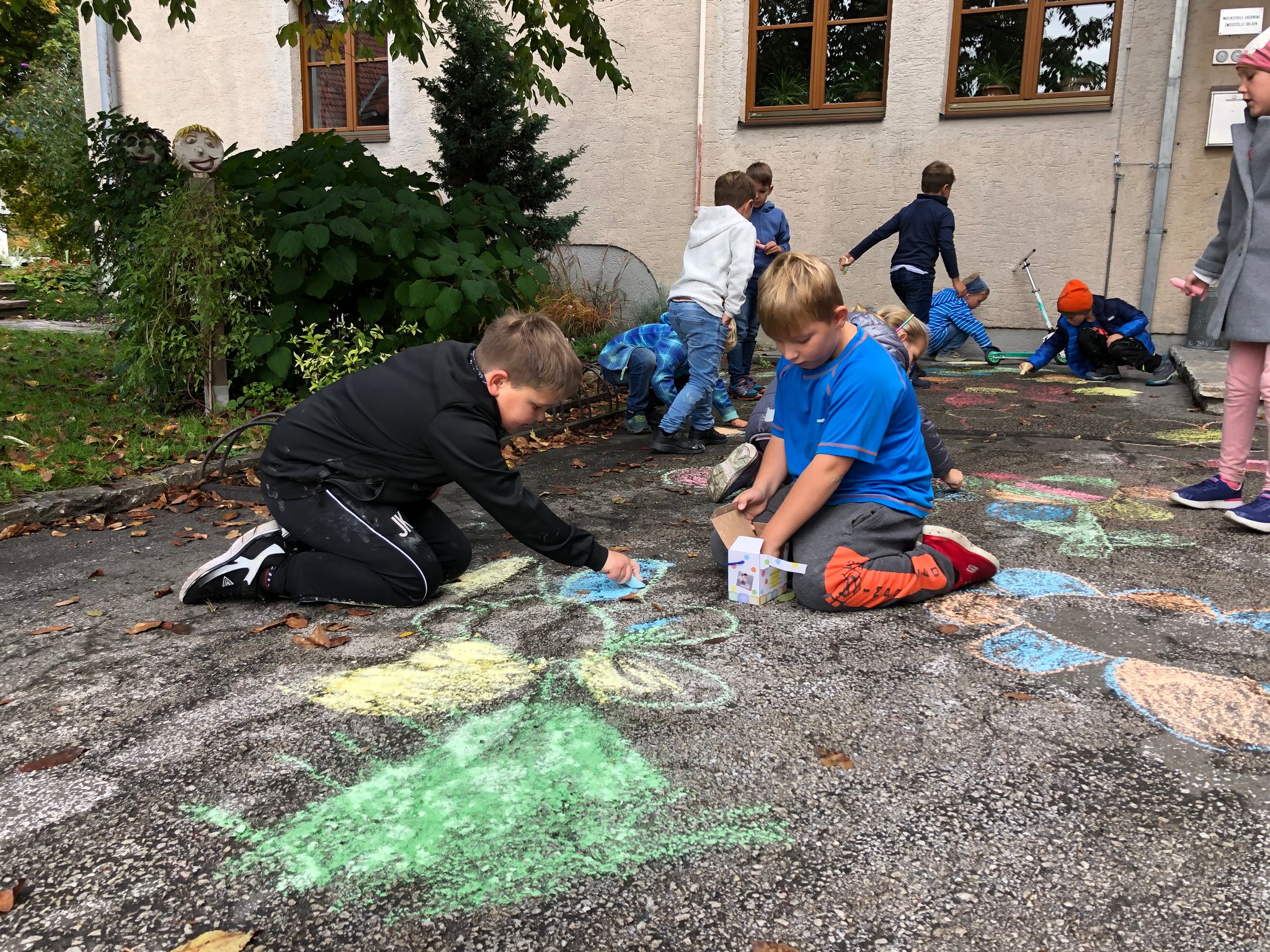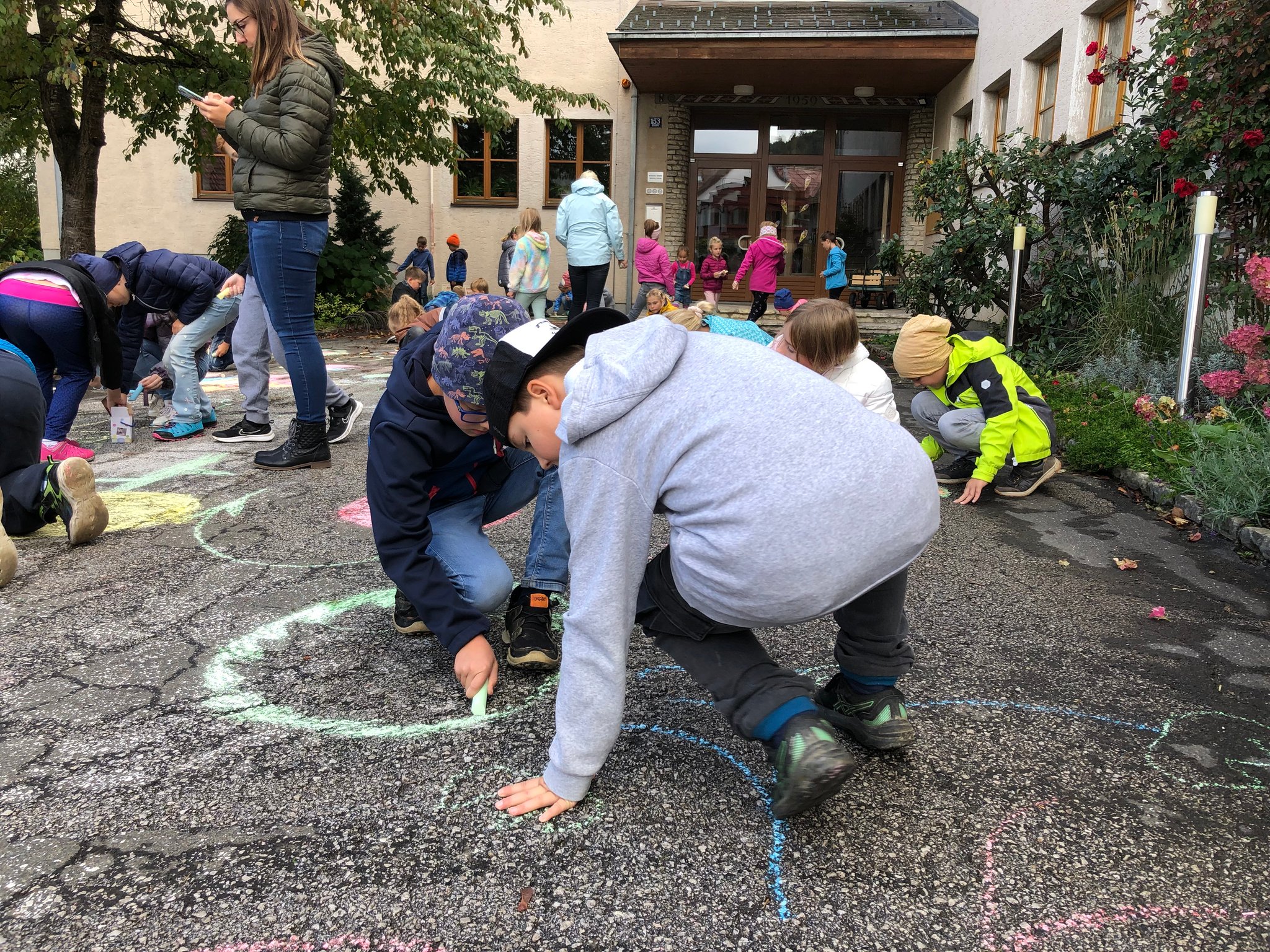 Im Zuge des Projektes "Blühende Straßen" wurden im Gespräch mit den Kindern Vor- und Nachteile vom Transport mit Autos für Umwelt und Gesundheit besprochen. Die Kinder bahnten eine Bewusstheit darüber an, wann und warum es sinnvoller ist einen Weg zu Fuß zurück zu legen. Diese wurde anschließend in einer gemeinsamen Zeichenarbeit vor der Schule gefestigt. Die Schülerinnen und Schüler gestalteten die Straße vor unserer Schule mit Straßenmalkreiden zu einer bunten Blumenwiese um.